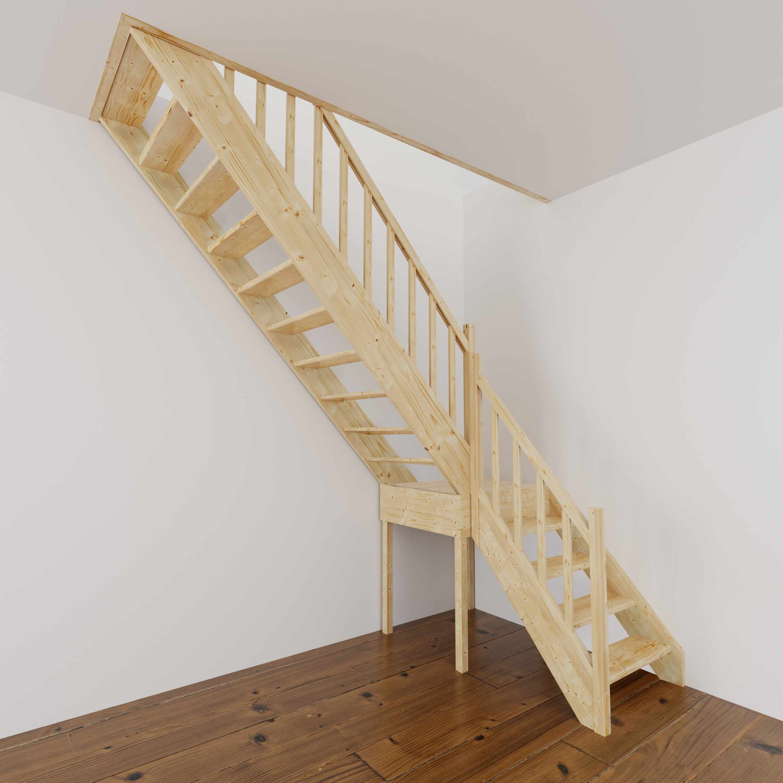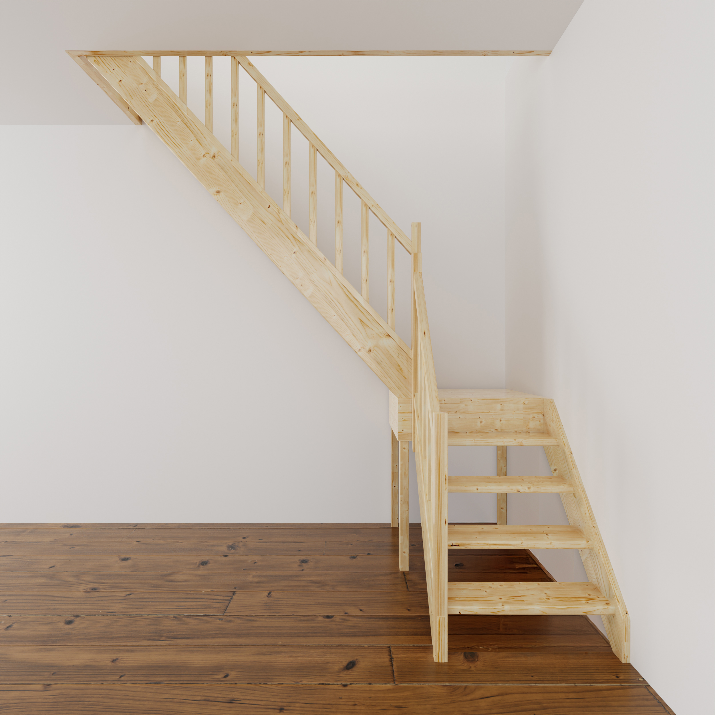 Materiał z którego wykonano schody to wysokiej jakości drewno świerkowe. Drewno nie posiada żadnych naturalnych wad. Schody bez podstopnic i z poręczą drewnianą szczebelkową, do samodzielnego montażu i malowania.