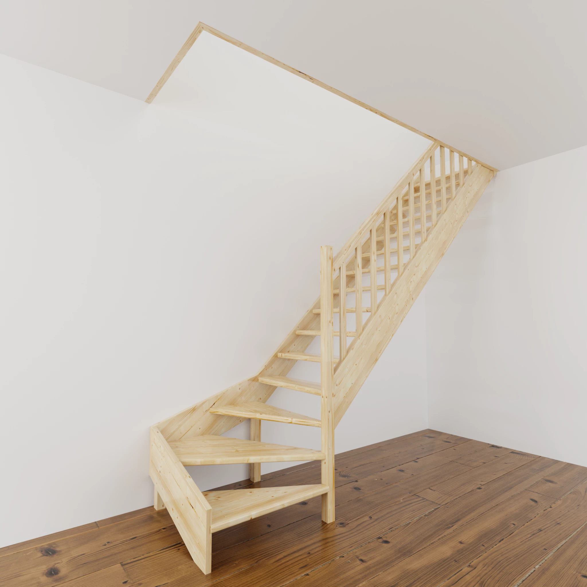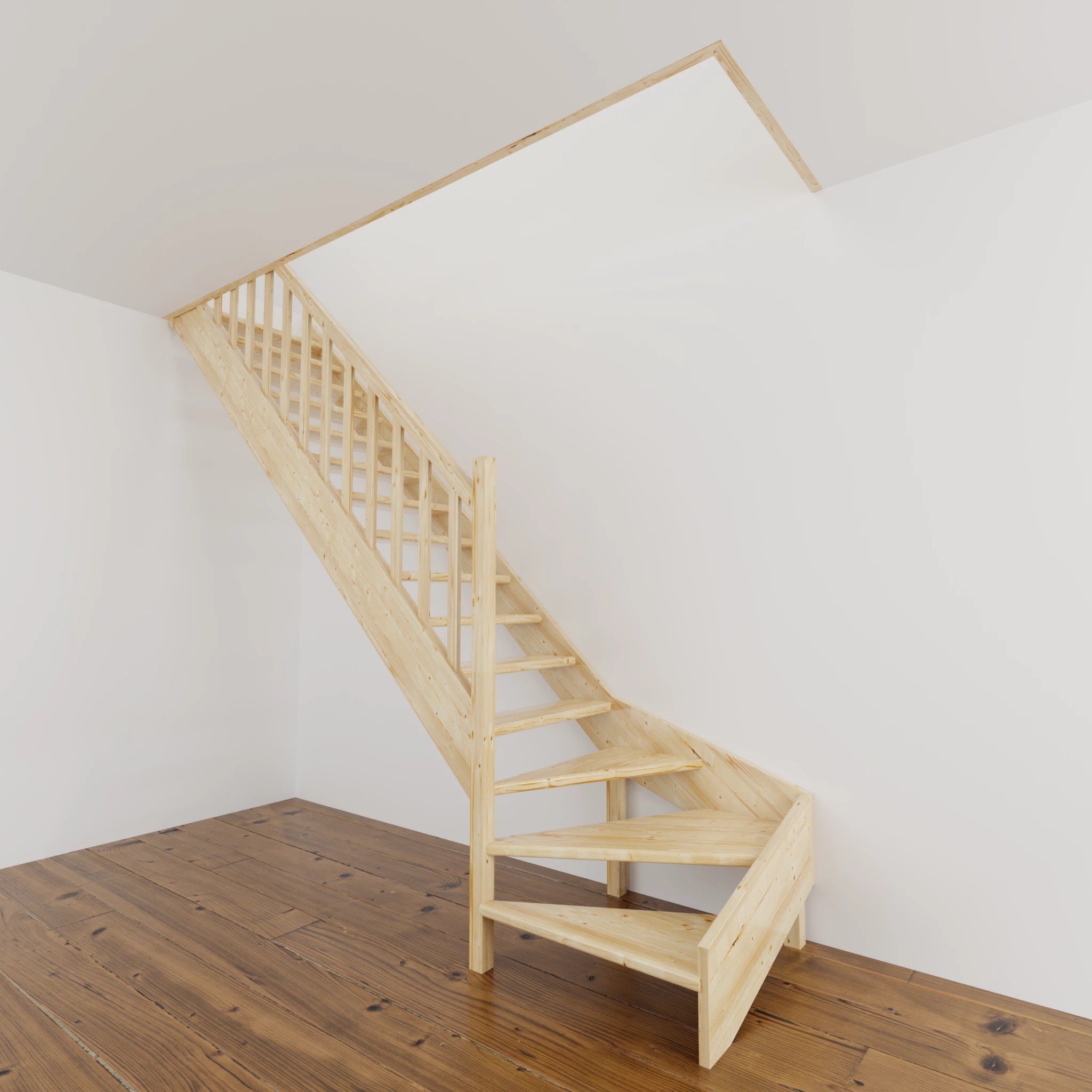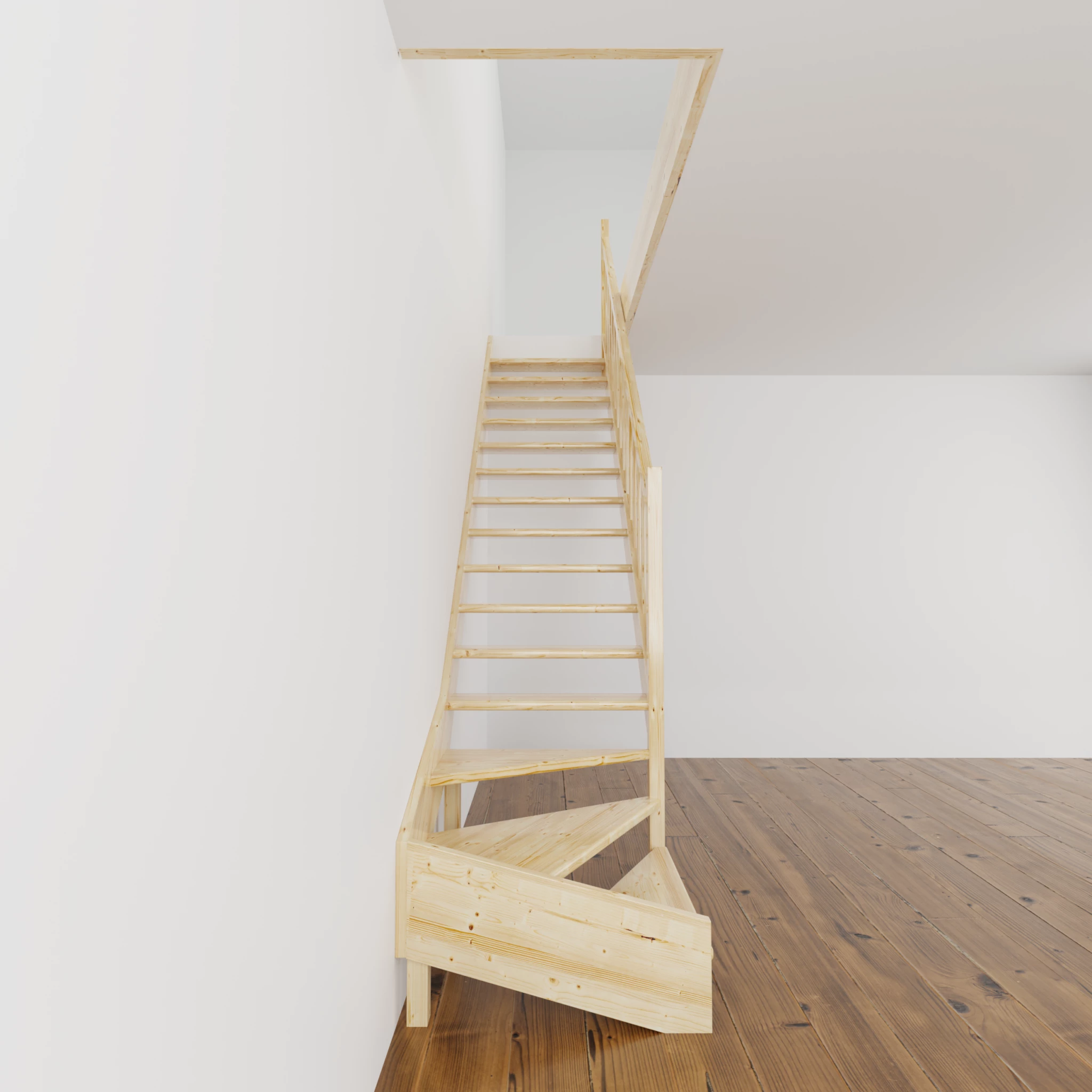 Materiał z którego wykonano schody to wysokiej jakości drewno świerkowe. Drewno nie posiada żadnych naturalnych wad. Schody bez podstopnic i z poręczą drewnianą szczebelkową, do samodzielnego montażu i malowania.