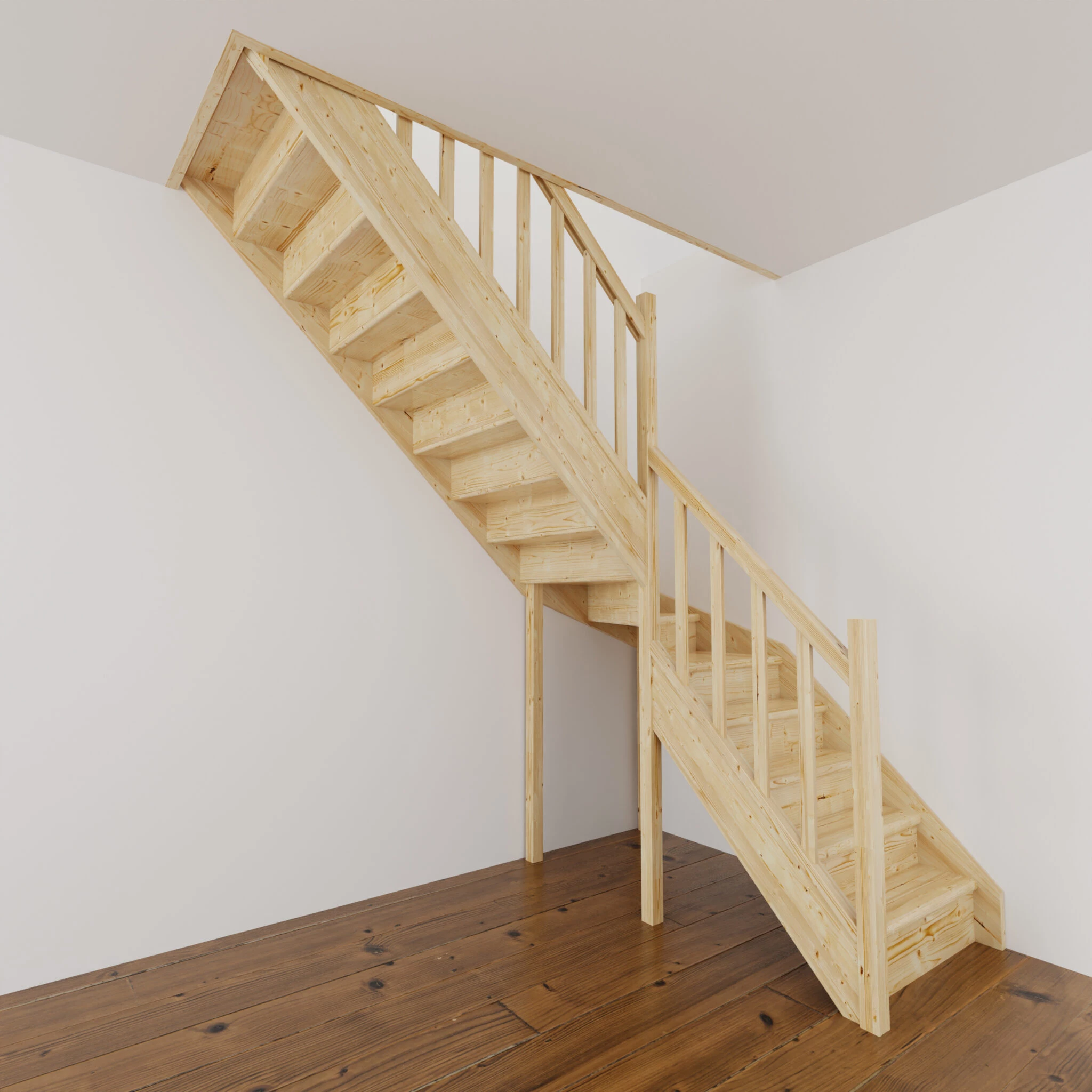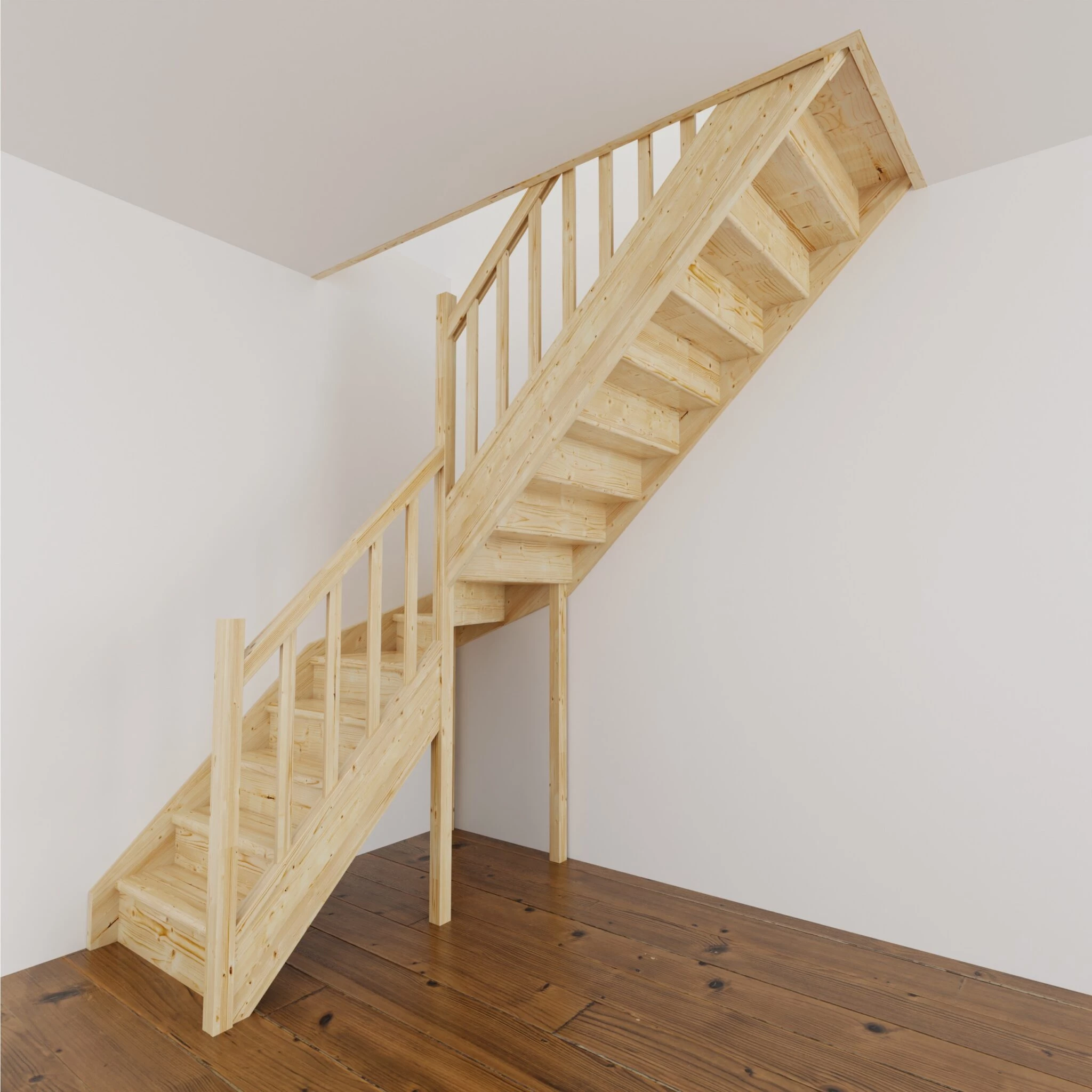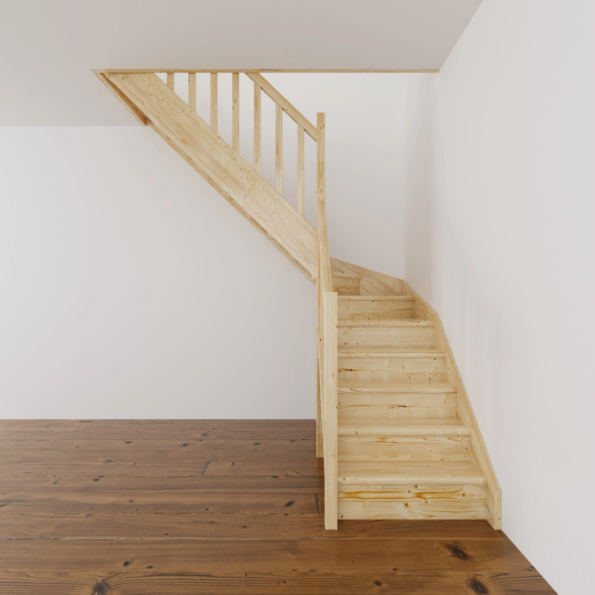 Materiał z którego wykonano schody to wysokiej jakości drewno świerkowe. Drewno nie posiada żadnych naturalnych wad. Schody z podstopnicami i poręczą drewnianą szczebelkową, do samodzielnego montażu i malowania.