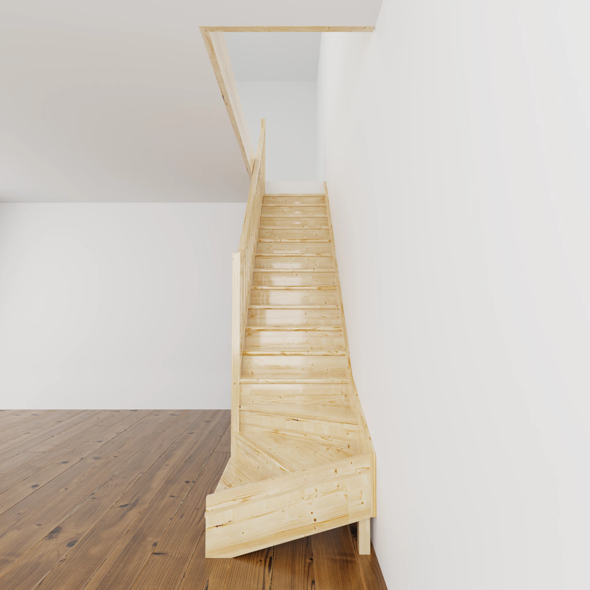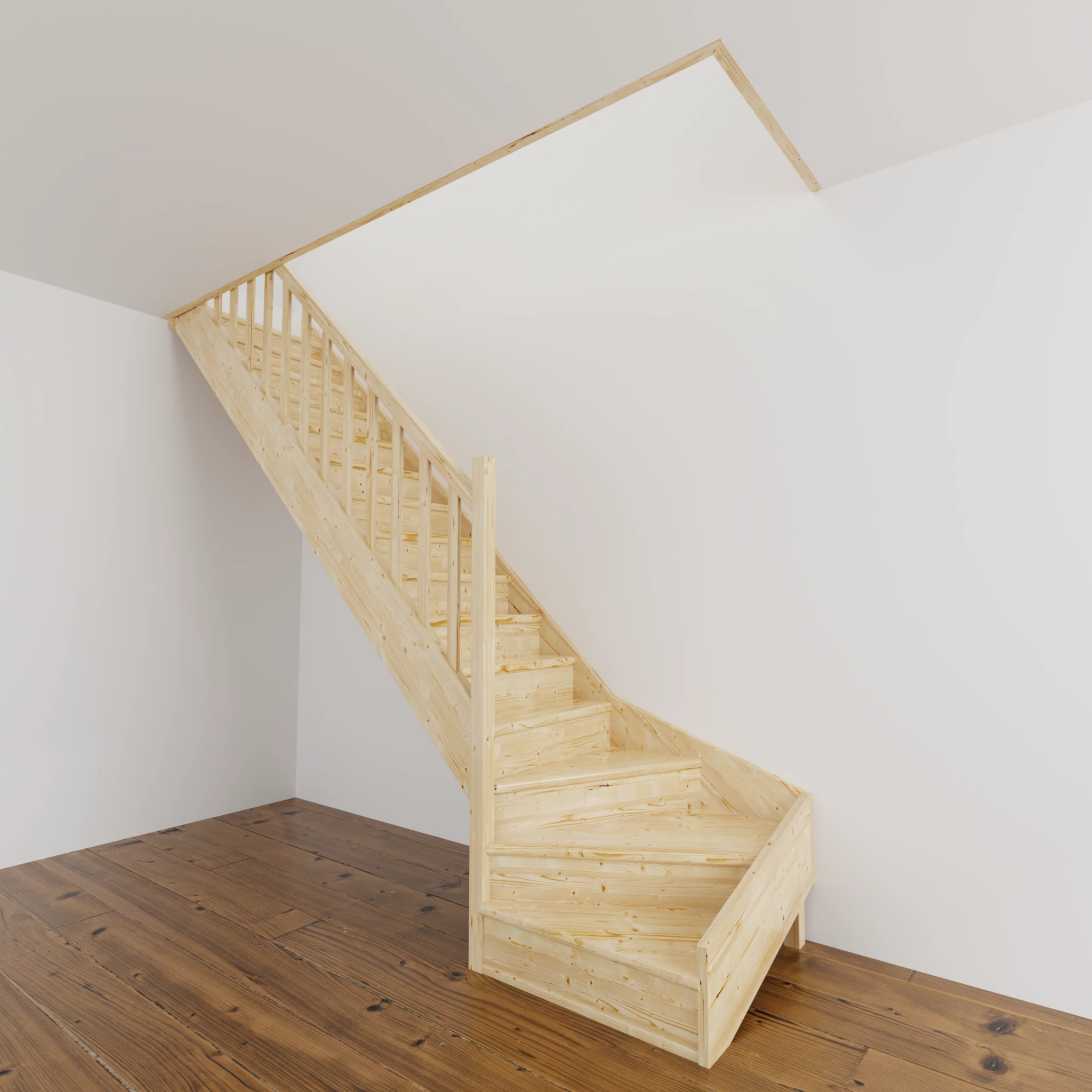 Materiał z którego wykonano schody to wysokiej jakości drewno świerkowe. Drewno nie posiada żadnych naturalnych wad. Schody z podstopnicami i poręczą drewnianą szczebelkową, do samodzielnego montażu i malowania.